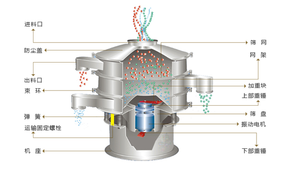 三次元圆形网站免费正能量软件采用YZUL立式振动电机作为激振源,通过振动电机上下两端的偏心重锤将旋转运动转变为水平、垂直、倾斜的三次元运动,并传递到网站免费正能量软件的筛面上;物料通过入料口进入设备内,根据不同物料筛分要求,物料经过1-5层采用不同目数的金属编织筛网的筛分层,在这个过程中,位于各层的筛网下的清网装置(弹跳球)通过频率振动不断撞击不锈钢筛网,使筛网上层物料能够顺畅的透网筛分,并有效解决了物料堵网问题出现,不同目数的物料通过各层对应目数的筛网后在各层的出料口排出,终实现筛选除杂或过滤分级的目的。