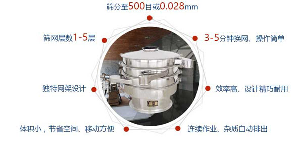 3、筛网不阻塞、粉末不飞扬、筛分细可达500目(28微米)过滤细可达5微米。